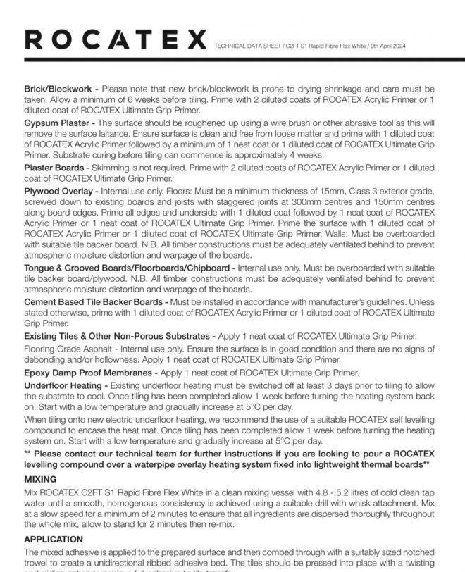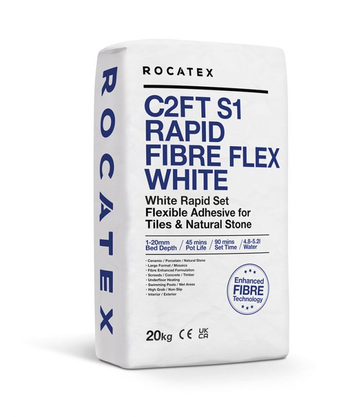 ROCATEX C2FT S1 Rapid Flex White is a single part, flexible wall and floor tile adhesive for fixing natural stone and tiles including ceramics, porcelain and mosaics to a variety of substrates. Suitable for interior and exterior use.
