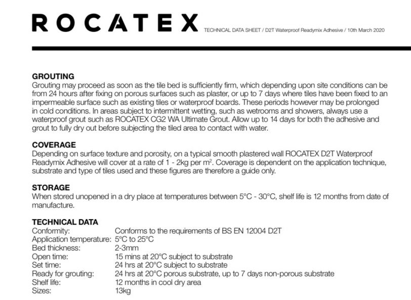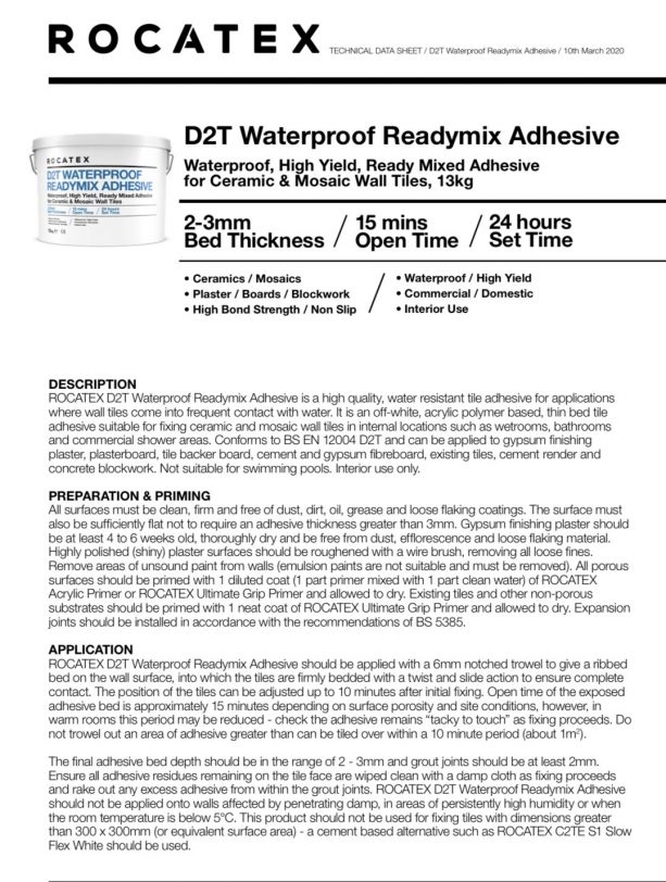 ROCATEX D2T Waterproof Readymix Adhesive is a high quality water resistant tile adhesive for applications where wall tiles come into frequent contact with water. It is a buff coloured acrylic-based paste, suitable for use as a thinbed ceramic and mosaic wall tile adhesive and conforms to BS EN 12004 D2TE. ROCATEX D2T Waterproof Readymix Adhesive can be applied to gypsum plaster, plasterboard, tile backer board, cement and gypsum fibreboard, existing tiles, cement render and concrete blockwork. Suitable for wetrooms and commercial use.