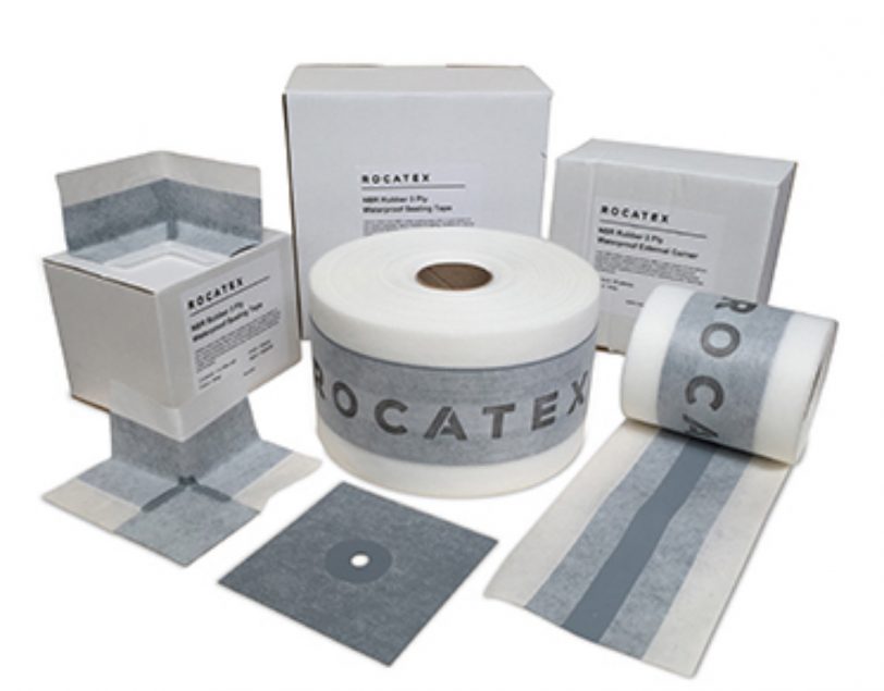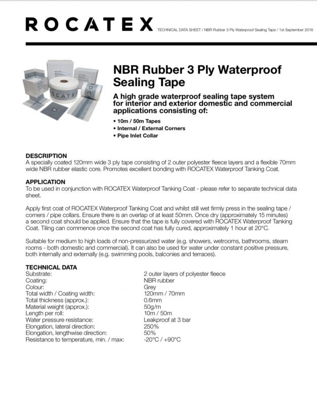 A specially coated 120mm wide 3 ply tape consisting of 2 outer polyester fleece layers and a flexible 70mm wide NBR rubber elastic core. Promotes excellent bonding with ROCATEX Waterproof Tanking Coat.