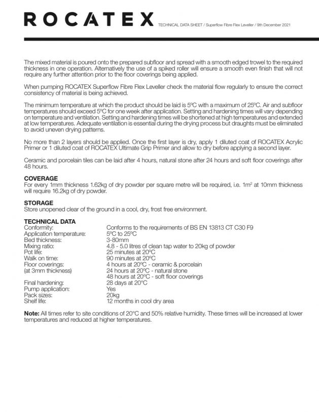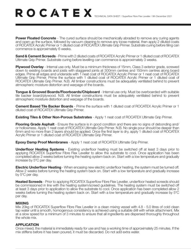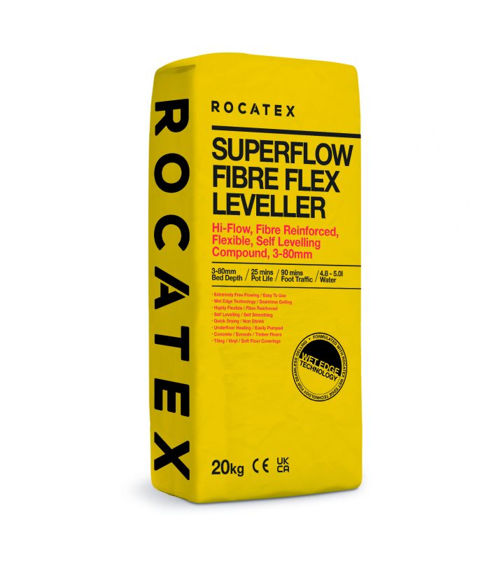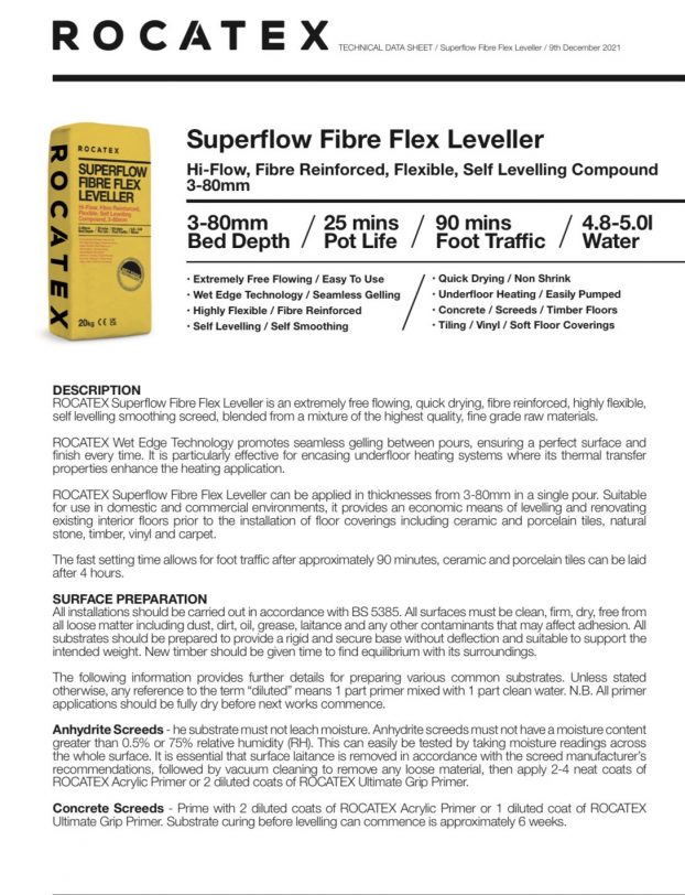 ROCATEX Superflow Fibre Flex Leveller is an extremely free flowing, quick drying, fibre reinforced, highly flexible, self levelling smoothing screed, blended from a mixture of the highest quality, fine grade raw materials.